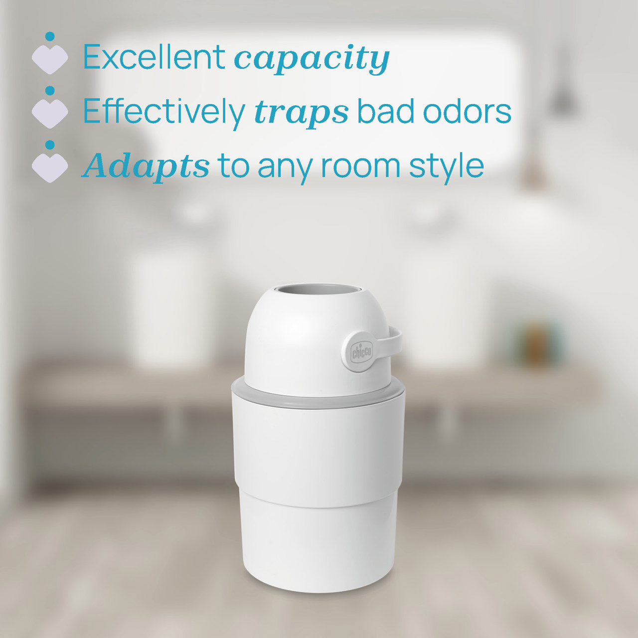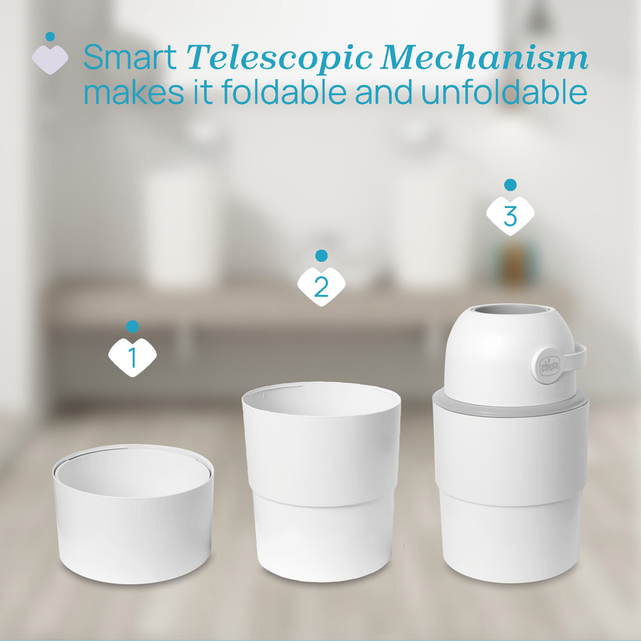 Une fois pleine, le sac se retire facilement, minimisant ainsi la propagation des odeurs. Compatible avec des sacs ordinaires ou spécifiquement conçus par Chicco, elle s’ajuste parfaitement à vos besoins. Son mécanisme télescopique astucieux permet de réduire sa taille pour un transport et un rangement faciles.