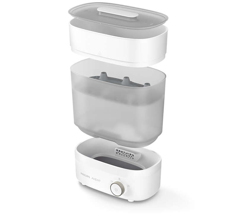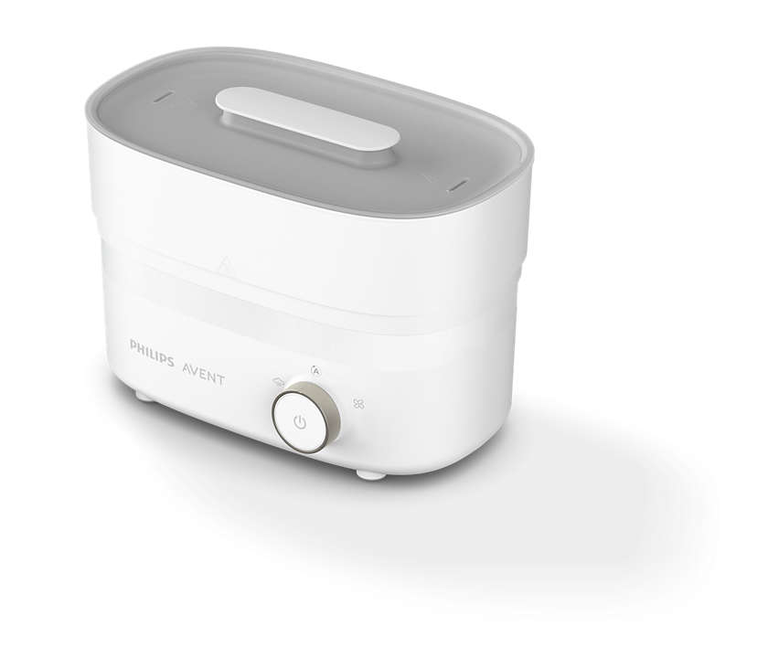 Pour un cycle complet de stérilisation et de séchage, il faut compter uniquement 40 minutes, et le contenu reste stérile pendant 24 heures, à condition que le couvercle reste fermé. Le stérilisateur sèche-biberons Avent électrique est équipé d’un bac d’égouttement intégré permettant de réduire le risque d’odeurs désagréables. Le stérilisateur est facile dans l’entretien. Rapide et hygiénique, le stérilisateur élimine 99,9 % des microbes* pour que vous ayez l’esprit tranquille à chaque tétée.
