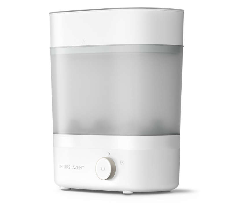 Le stérilisateur sèche-biberons Avent électrique permet tout d’abord de stériliser les biberons et accessoires à la vapeur, puis de les sécher par un jet d’air filtré pour une utilisation instantané.