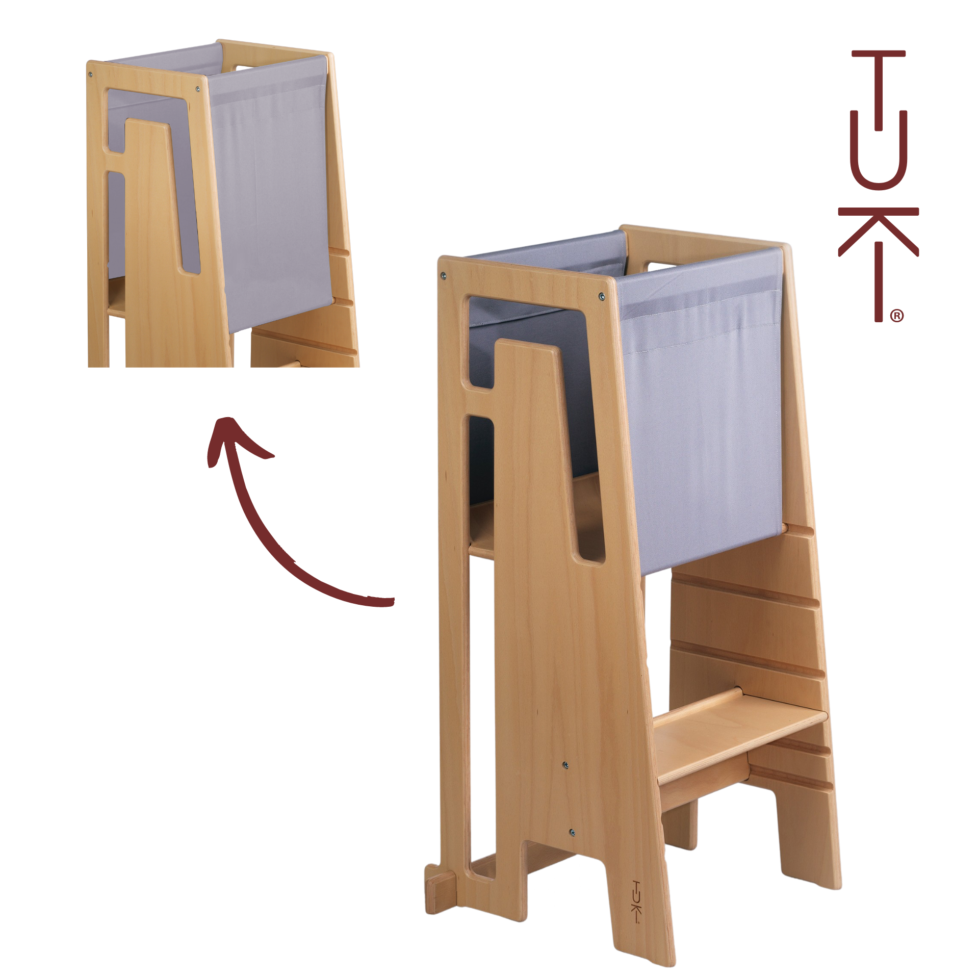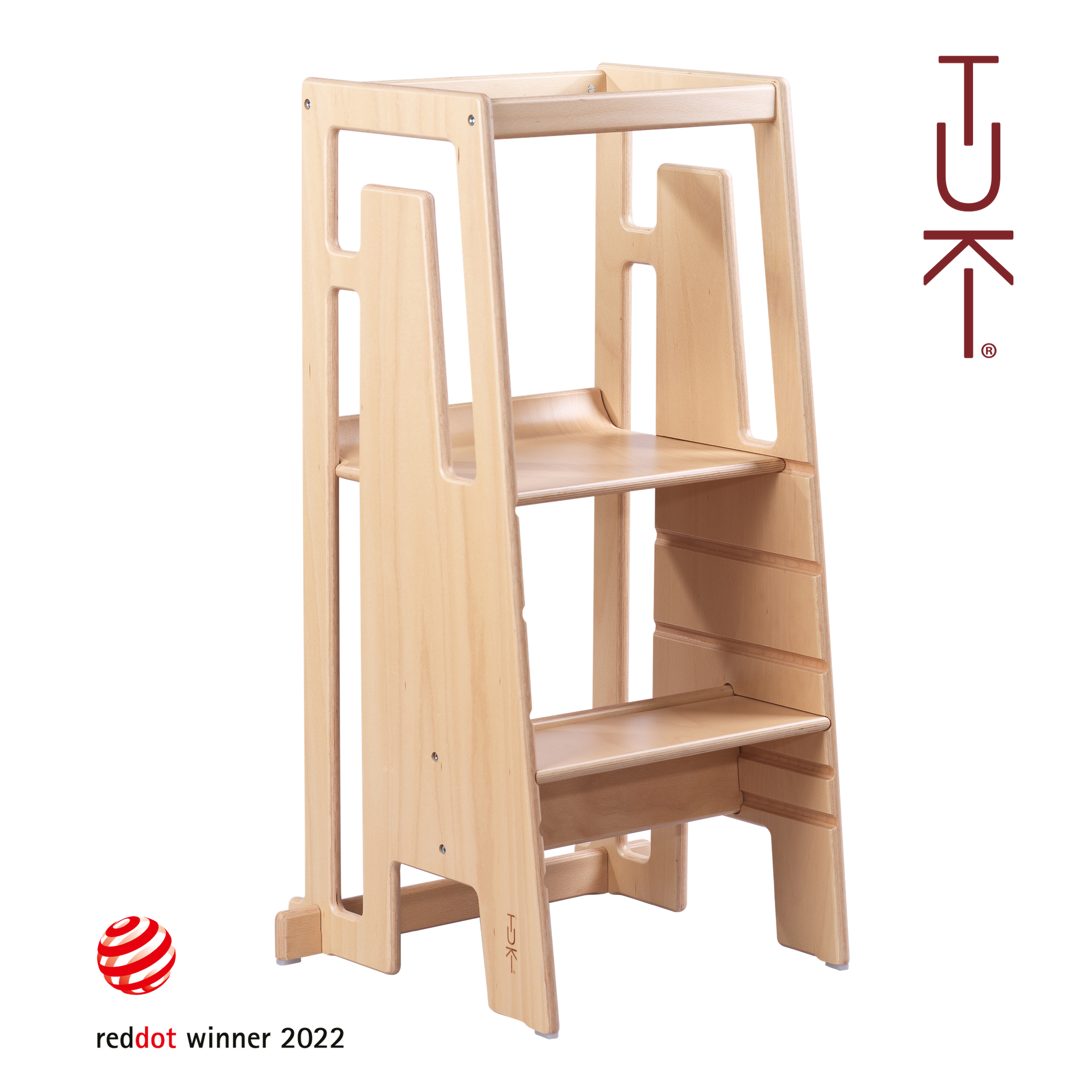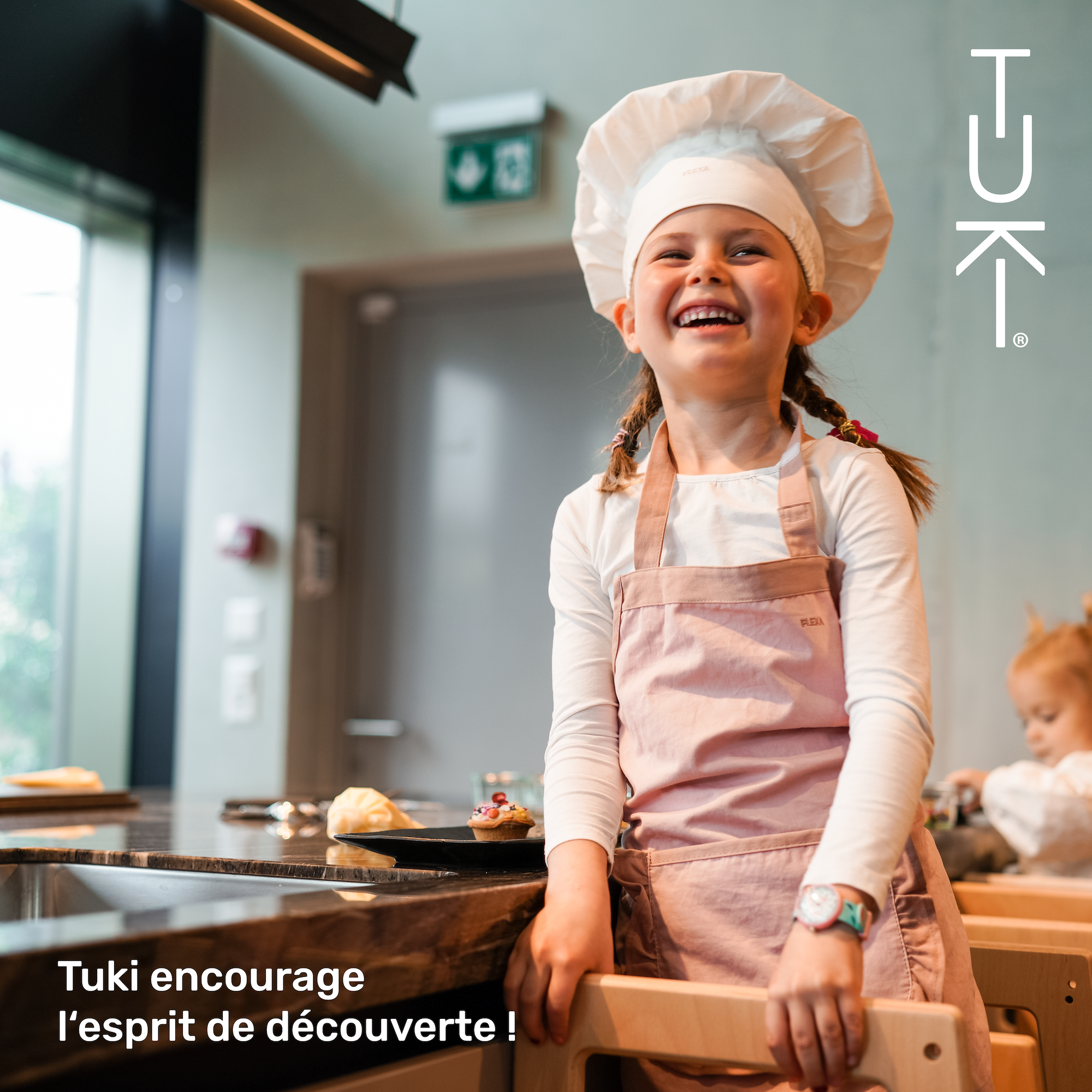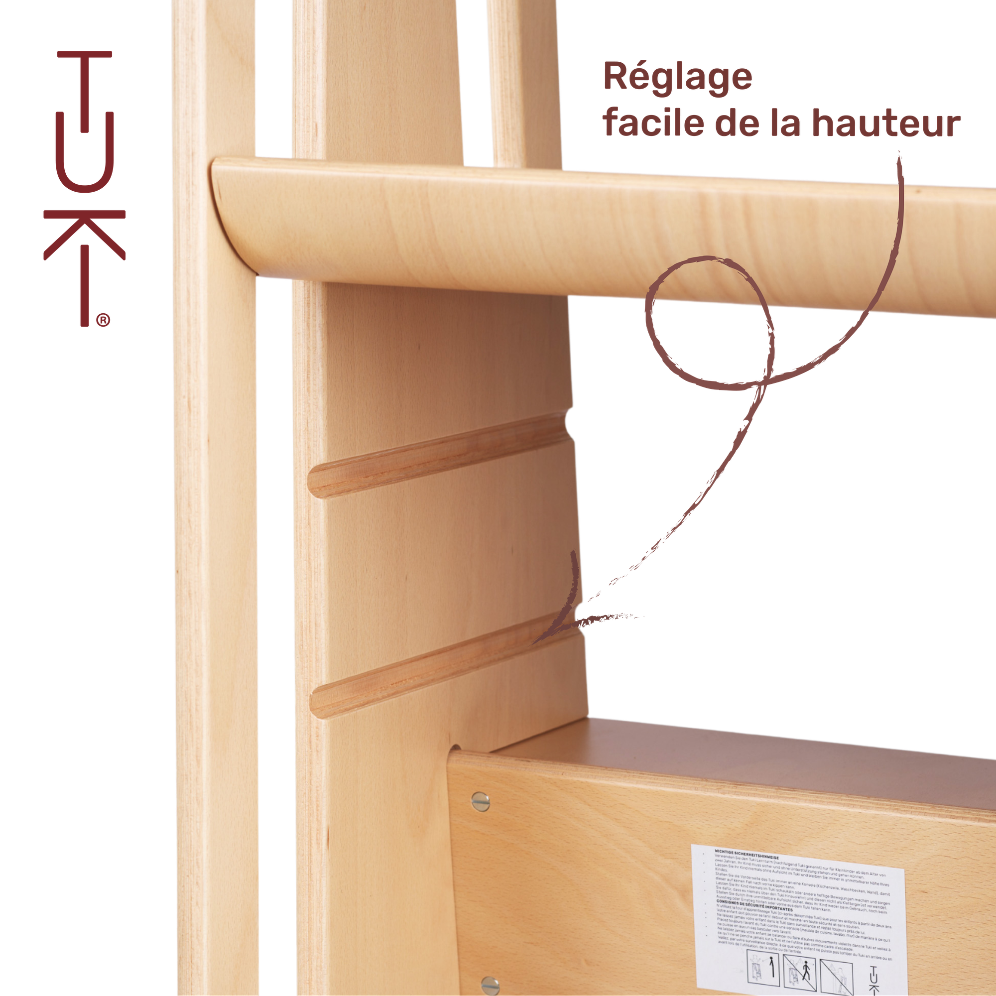 La Tour d’apprentissage Tuki nature permet aux petits enfants de remuer la poêle avec leurs parents dans la cuisine, de découper des biscuits à la table de la cuisine, de bricoler dans l’atelier ou de se laver les mains dans la salle de bain. Les enfants veulent découvrir le monde par eux-mêmes. Mais les plateaux de table, les plans de travail dans la cuisine ou la vue par la fenêtre restent longtemps inaccessibles pour eux. Notre Tuki élève les jeunes enfants au niveau de l’action dans chaque foyer et stimule l’imagination, la créativité et la passion.