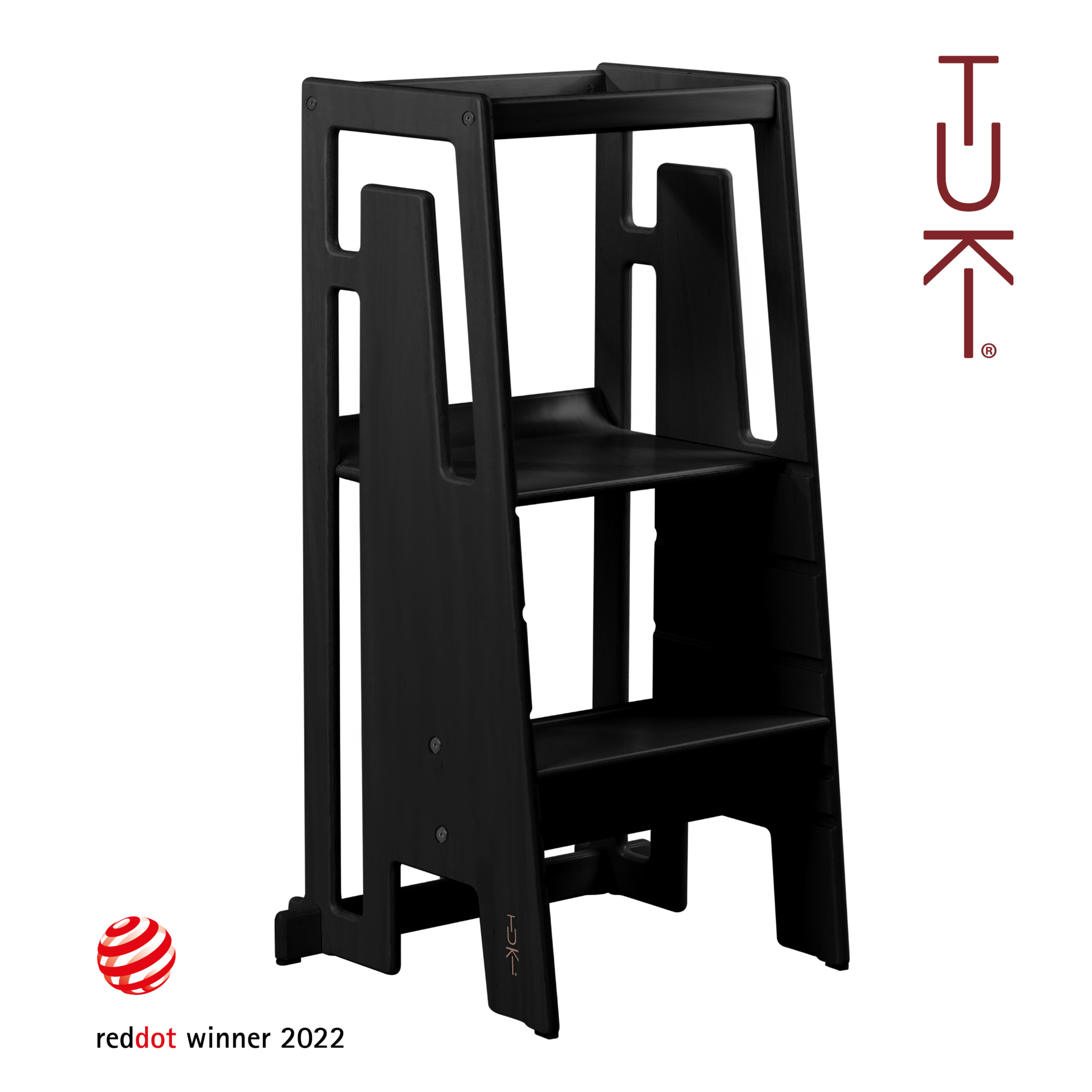 La Tour d’apprentissage Tuki noir permet aux petits enfants de remuer la poêle avec leurs parents dans la cuisine, de découper des biscuits à la table de la cuisine, de bricoler dans l’atelier ou de se laver les mains dans la salle de bain. Les enfants veulent découvrir le monde par eux-mêmes. Mais les plateaux de table, les plans de travail dans la cuisine ou la vue par la fenêtre restent longtemps inaccessibles pour eux. Notre Tuki élève les jeunes enfants au niveau de l’action dans chaque foyer et stimule l’imagination, la créativité et la passion.