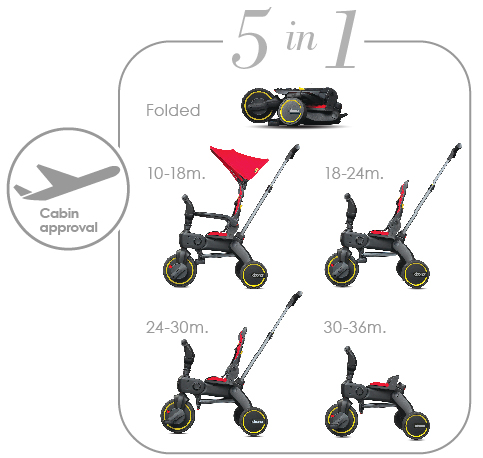 Le tricyle Liki Trike S5 est le plus compacte du monde. La version Deluxe S5 est dotée d’un sac de rangement, d’un sac de transport, d’un canopy anti-UV Le tricycle est doté d’une canne de poussée ajustable en hauteur et amovible une fois que l’enfant est plus grand. La ceinture de sécurité s’adapte au fur et à mesure à votre enfant. Pour son confort, le siège, la ceinture de sécurité et la barre de sécurité sont rembourrés et le dossier est inclinable. Au début, les pédales du Tricycle Liki Trike S5 font office de repose-pieds, réglables sur 2 positions en fonction de la taille de votre enfant. Caracteristiques: